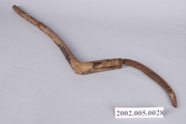 本文物為鐮刀,主要為收穫用農具,也在山林活動使用。用途主要為割草、稻麥、藤蔓等。鐮刀基本形式為彎月形鐵片,內緣為刀刃。本件鐮刀的刀片為1970年代以後發展出來的形式,刀片薄,內緣有鋸齒,後端為鐵片以插入木柄凹槽,接合處釘上鐵釘並以鐵線圈起固定。本件木柄彎曲,應是使用者購買刀片後因應作物割取需求自行安裝木柄,以改變割取方向。