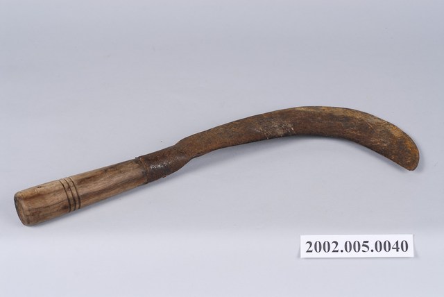 本文物為鐮刀,又稱草鐮、草刀、割草刀。鐮刀主要為收穫用農具,也在山林活動使用。用途主要為割草、割稻麥、藤蔓等。本件鐮刀的刀片為細長形,便於深入草桿間,一次割取草量較多。鐮刀基本形式為彎月形鐵片,內緣為刀刃。本件刀片後端作成圓筒箍形以置入木柄,為清末至今傳統漢式農具作法。木柄則為1970年代以後工廠機械製品。