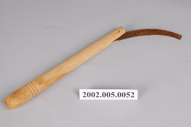 本文物為割稻刀,為鐮刀的一種,因主要用來割稻,名為割稻刀。鐮刀主要為收穫用農具,也在山林活動使用。用途主要為割草、割稻麥、藤蔓等。鐮刀基本形式為彎月形鐵片,內緣為刀刃,割稻刀的刀片為細長形,刀刃改為鋸齒,為1970年代以後發展出的鐮刀形式,在割稻上取代了傳統的鐮刀。割稻刀的刀片後端插入木柄凹槽中,木柄頂端以鐵釘加強固定。本件木柄為工廠機械生產製品。木柄上印有藍色「正 陳財」文字,「陳財」可能為鐮刀製造商或農具行商號,「正」字以圓圈圈起,表示為正品之意。
