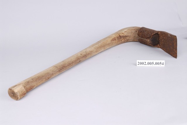 本文物為錛仔,日本寫作錛,中國稱錛或錛子。日本時代由日本引入錛仔,於伐木造材作業時使用,用來修平木材的工具。本件錛仔刀面厚實,刀刃為平口,刀面與柄平行,刀面後端收為兩片鐵箍包住彎木柄。造材作業是在把樹砍倒後,在現場將樹木去除樹皮並切成方形角材,減輕重量以便搬運。先以斧頭去除樹皮及將木頭砍劈成斷面為四角的平面,再以錛仔修整平面,完成造材作業。