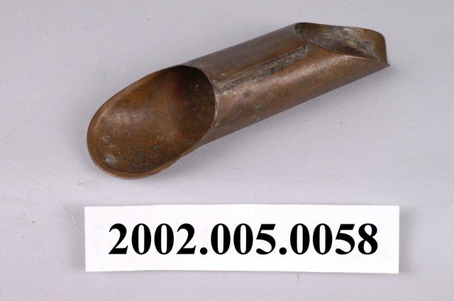 本文物為蒔田管,蒔田為插秧之意,是插秧時的農具。又稱指管,取套於指頭上之意。本件蒔田管以銅片製作,一端呈三角尖形,農人插秧時套在右手拇指上,將尖端置於手的外側,從秧船中將秧苗取出時,可以尖端作截切,接著將秧苗插入土中,蒔田管可發揮保護拇指的功能。