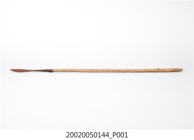 本文物為魚槍,是臺灣原住民的捕魚工具。本件魚槍前端為柳葉形鐵刀,鐵刀後端收為筒狀箍以套入木長柄。魚槍為長柄,便於深入水中刺魚。外形近似阿美族的魚具。鐵件作法是在與漢人接觸後開始發展,清末至今刀身形式未變,刀柄作法、刀的材料演變與漢式農具相同。