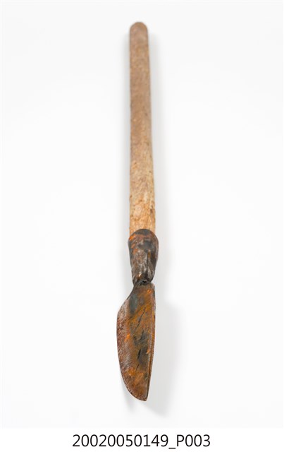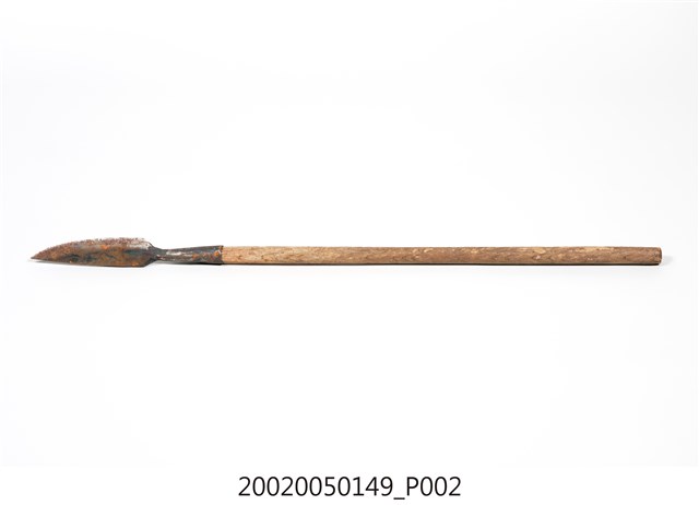 本文物為標槍,是臺灣原住民的狩獵工具。本件標槍前端為長尖形白鐵刀,彎弧面作刀刃,刀身後端收為圓筒箍,套入木長柄。長柄,便於射獵或刺入獵物。鐵件作法是原住民在與漢人接觸後開始發展而成,其後刀柄作法、刀的材料演變與漢式農具相同。本件木柄為機器成形製品,為戰後所作。