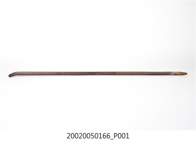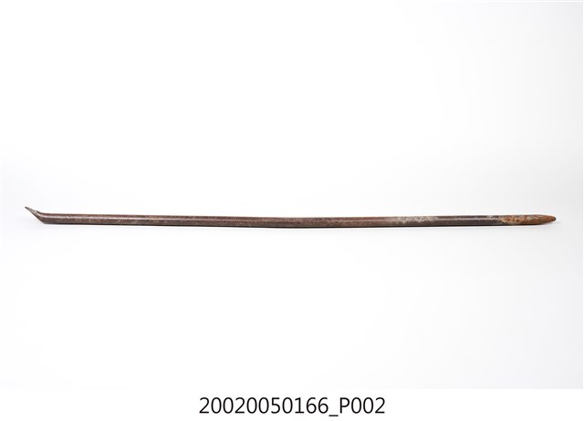 本文物為掘棒,是臺灣原住民的農具。本件掘棒為鐵製,前端為尖錐形,後端略彎曲便於握持。用途為挖土洞。原來以木削製,本件為機器成形的圓鐵條製,為戰後製品,形式仍遵原住民傳統。