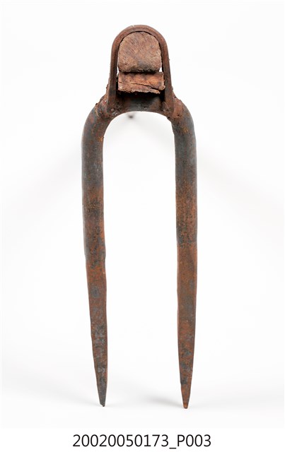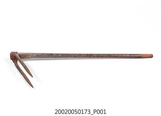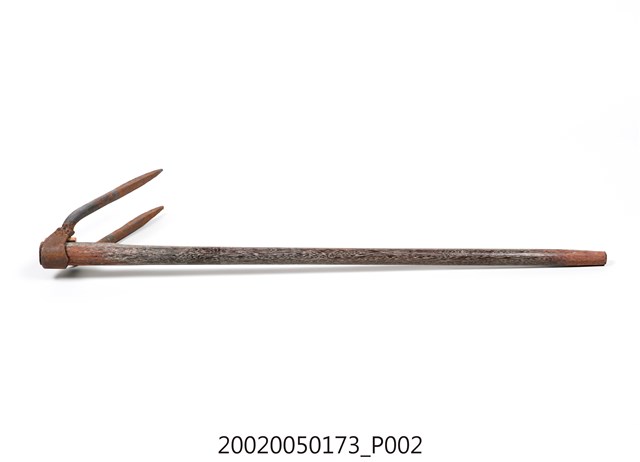 本文物為二齒耙,因有二齒而名之,為鬆土的農具。齒尖且長,尾端收成D字形鐵箍以置木柄,並塞以鐵片、木片固定,為清末至今漢式傳統農具作法。長齒利於深挖,適用於石礫地或硬土地的深掘鬆土、清除草根使用。