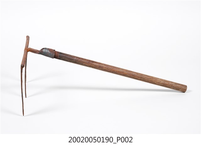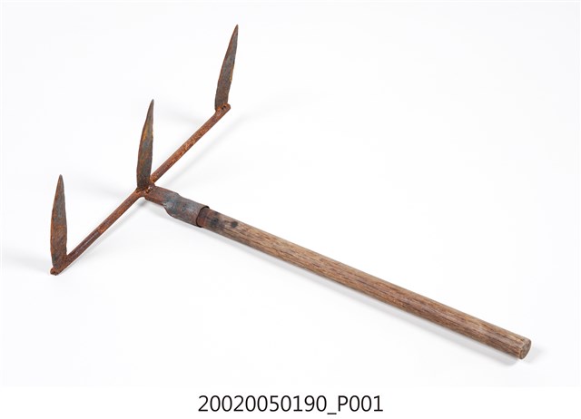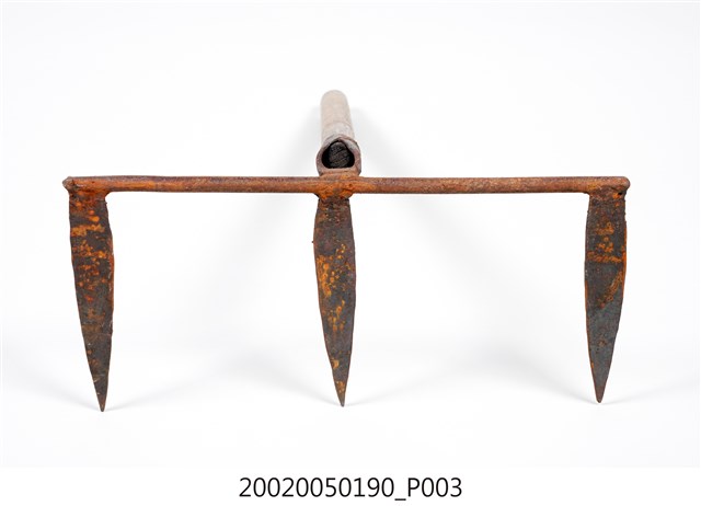 本文物為釘耙,耙有三齒,故稱三齒耙。本件三齒耙為長柄,柳葉形尖齒,為整地用農具,功能為鬆土。本件鐵杷後端作成圓筒形箍以置木柄,為清末至今傳統漢式農具作法。