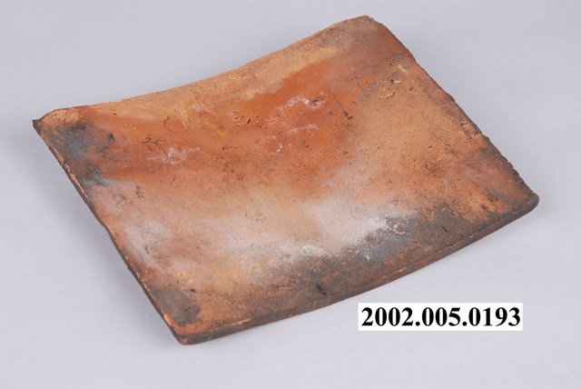 本文物為板瓦,又稱薄瓦,用於傳統漢式建築屋頂。為手工瓦,呈磚紅色的傳統板瓦,略具弧度。鋪設時以凸面朝上,為合瓦,凹面朝上,為仰瓦。板瓦多使用於漢式傳統民宅的屋頂,廟宇則於主要空間使用筒板瓦相間屋頂,較次要空間的屋頂使用全板瓦。板瓦由屋脊往屋簷交疊往下成道排列,一排仰一排覆。施作時先鋪仰瓦,再覆合瓦。