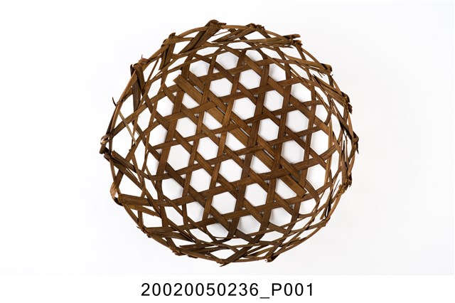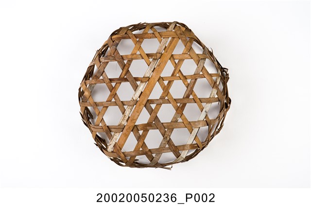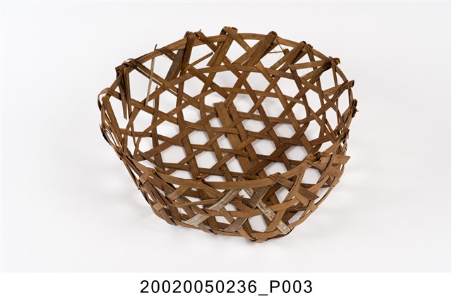 1.寬竹篾編成的小筐籃,整體以簡易六角孔編法構成,底部編成後再於周邊加上圓形竹條框架作為固定,共計三條,呈直角往上再編,上部緣口以摺返法收編,製成能盛物的籃子。由於使用頻繁與年代久遠,口緣部分的竹篾已出現多處斷裂毛刺以及籃體變形的現象。此類竹筐因為底部沒有加固的設計,所以僅能盛裝重量較輕的物品。2.這類小筐籃是早年臺灣家庭常見的收納籃,尤其是農家,多用來做為放置水果、食物等的容器。
