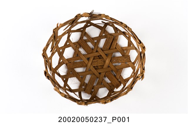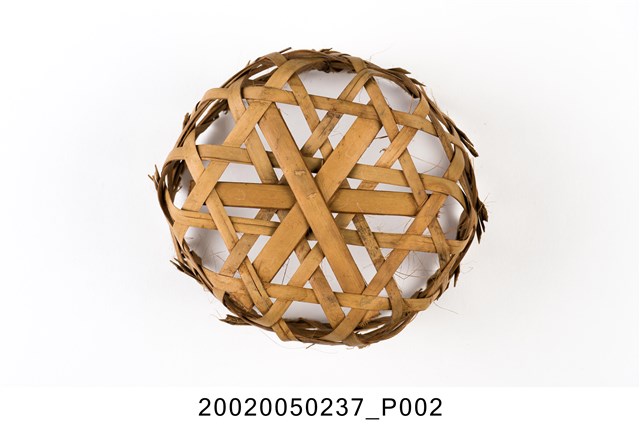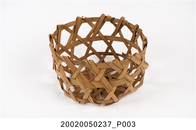 1.寬竹篾編成的小筐籃,整體以簡易六角孔編法構成,底部編成後再於周邊加上圓形竹條框架作為固定,共計三條,呈直角往上再編,上部緣口以摺返法收編,製成能盛物的籃子。由於使用頻繁與年代久遠,口緣部分的竹篾已出現部分破裂毛刺的現象。此竹筐因為整體相當小巧,所以僅能盛裝小型質輕的物件。2.這類小筐籃是早年臺灣家庭常見的收納籃,尤其是農家,多用來做為放置小型物品的容器。