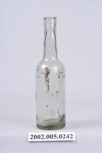 1.此件玻璃瓶由透明玻璃製成,長約6.2公分,寬約6.3公分,高約22.4公分。瓶口有收邊,往下有三圈突起,瓶頸瘦長,至瓶身向外呈圓弧狀,並直筒到瓶底。瓶身壓有圖樣與文字,但難以辨識。瓶身有髒污痕跡,玻璃內有氣泡。2.臺灣在早期民生用器具多由陶、瓷製成,玻璃製品屬珍稀進口物品,多為上層社會人士所用。直到日治時期受總督府西化、現代化的影響下,引進與開發玻璃產業,玻璃製的日常用品才漸普及於社會大眾。