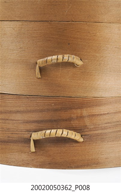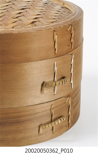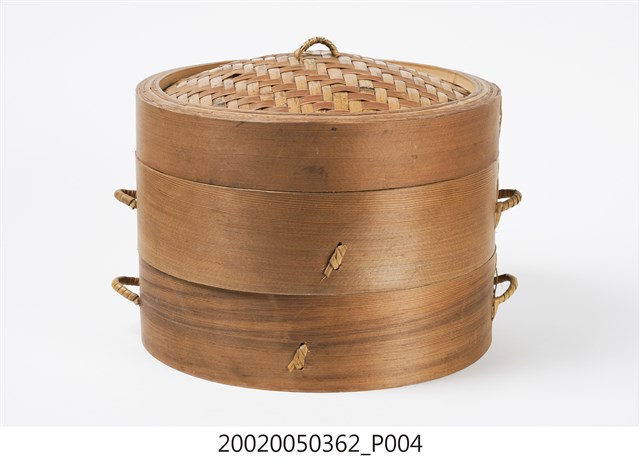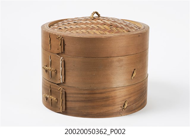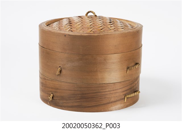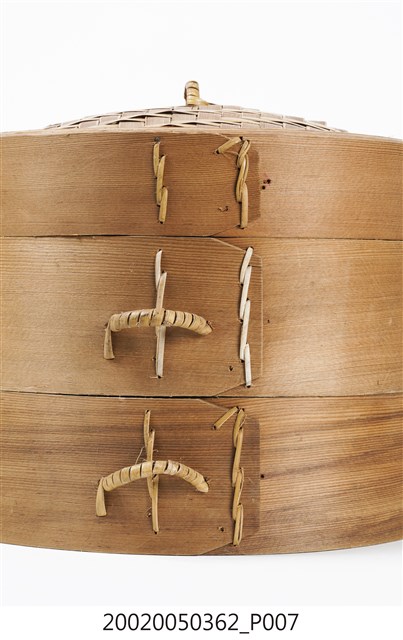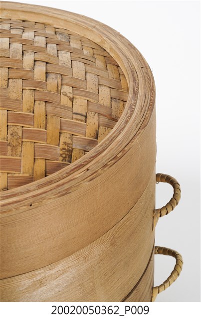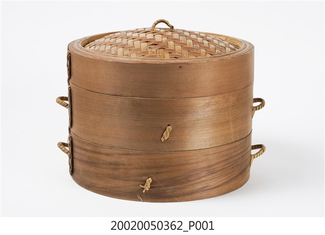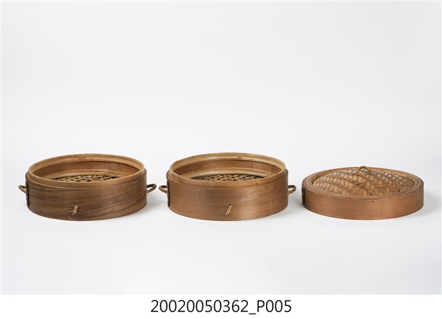 1.圓形竹製蒸籠組,共一組三件,包括一層頂蓋與兩層籠身。頂蓋與籠身周邊以薄木片多層繞圍箍緊做成圓形外框,以寬的竹片烤彎作為外框內圈,穿孔後以藤皮紮牢,再以竹片編成上下通氣的籠底,可多層堆疊,層層之間可緊密扣合,使得熱氣在籠裡蒸騰,好讓食物蒸熟。2. 蒸籠為傳統蒸煮的食具,一般圓形蒸籠是由竹片、竹篾、木片和藤繩製成,由於材質輕巧、頂蓋密合度佳,天然材質能夠吸收多餘水蒸氣,並且保持食物適當的含水量,蒸煮後的食物帶有竹片或木片的天然香味,早年普遍存在於一般家庭。使用時可依照食物的多寡調整蒸籠層數,若保養得當可耐用數十年。