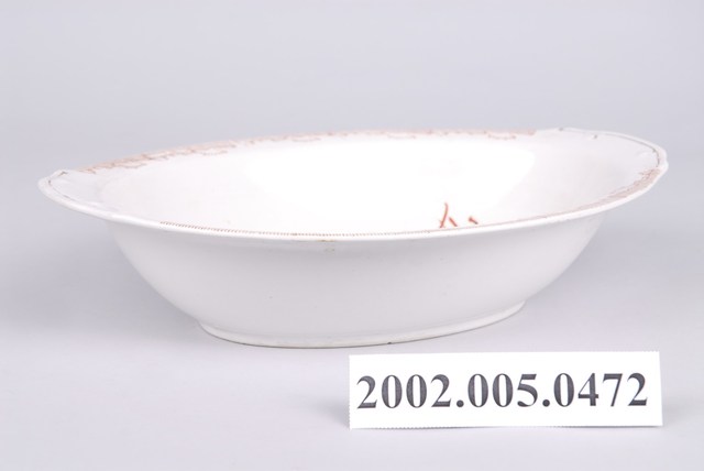1.印繪白瓷紅蝦折沿橢圓盤為高溫燒製且以模具塑成形,圓唇,寬折沿,兩端做耳狀,深腹,弧壁下斂至圈足,圈足露胎。全器施白釉,呈色雪白潤澤,釉面光滑。盤外壁素面無紋,主要紋飾繪於盤心。折沿兩端較窄處以金色釉勾勒線條裝飾,強調出托盤般的握耳效果;其餘的折沿處則以紅釉轉印線條為主的花草狀紋飾。主要紋飾繪於盤內中心,以模具施紅釉勾勒出大蝦的輪廓,強調出節節蝦身的特徵,再以大筆為蝦身填彩,紅釉發色飽和,蝦身用釉用色較淺,使紋飾頗具立體感。大蝦周圍繪以數筆藍釉線條增添畫面活潑感,同時暗示出水中環境。2.蝦蟹等殼甲類的紋樣時常運用在早期民間日常用器中,因為殼甲諧音「科甲」,有高中的吉祥寓意。
