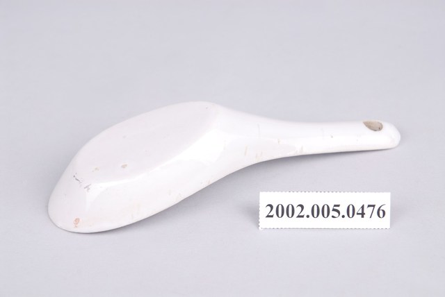 1. 紅釉蝦紋湯匙,長13.5 cm、寬4.5 cm、高5.2 cm,蝦紋湯匙以壓模製成胎體,湯匙裡紅蝦的身體輪廓以印模蓋上色釉,再加上部分手繪。蝦的腰呈鎧形,兩足前張,長鬚向後仰的蝦圖又叫「彎彎順」。柄端有孔。2. 以壓模製成胎體的湯匙為臺灣早期鶯歌或北投地區大量生產的食器。「蝦紋」常見於臺灣早期陶瓷製湯匙裝飾,餐桌上有魚有蝦,象徵富裕,此外,蝦的腰呈鎧形,而又能自由彎曲,並有很大的跳動力,所以寓意時來運轉與順利。柄端有孔的湯匙是由臺灣第一位赴日本學習陶藝的藝術家–林葆家(1915-1991)研發,用