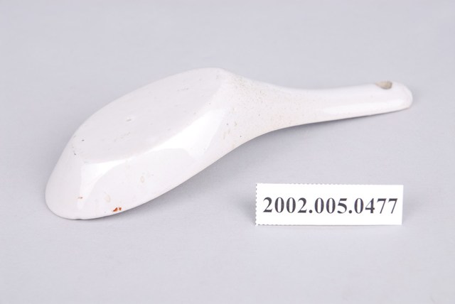 1. 紅釉蝦紋湯匙,長14.5 cm、寬4.5 cm、高5.1 cm,蝦紋湯匙以壓模製成胎體,湯匙裡紅蝦的身體輪廓以印模蓋上色釉,再加上部分手繪。蝦的腰呈鎧形,兩足前張,長鬚向後仰的蝦圖又叫「彎彎順」。柄端有孔。2. 以壓模製成胎體的湯匙為臺灣早期鶯歌或北投地區大量生產的食器。「蝦紋」常見於臺灣早期陶瓷製湯匙裝飾,餐桌上有魚有蝦,象徵富裕,此外,蝦的腰呈鎧形,而又能自由彎曲,並有很大的跳動力,所以寓意時來運轉與順利。柄端有孔的湯匙是由臺灣第一位赴日本學習陶藝的藝術家–林葆家(1915-1991)研發,