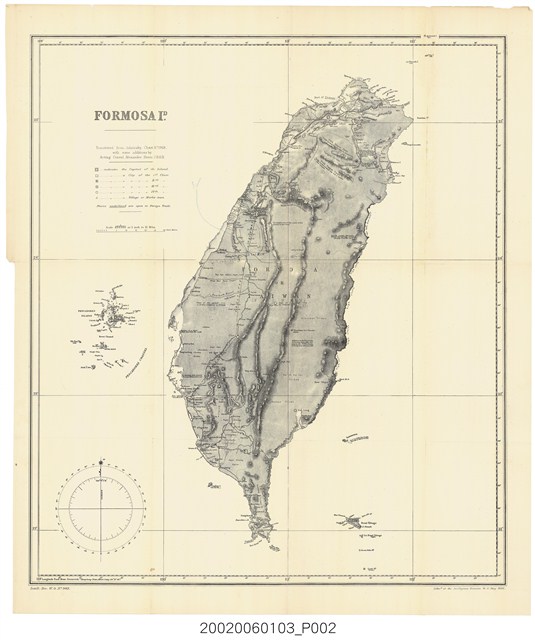 〈福爾摩沙島圖〉(Formosa Island), 比例尺696,960分1,原圖轉繪自英國海圖1968號,由英國駐淡水代理領事Alexander Hosei(1853–1925)增補,1893年對國會提出《臺灣島之資源及貿易報告》(The Island of Formosa with Special References to its Resources and Trade)之附圖。