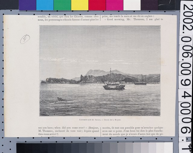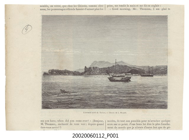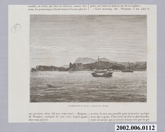 1. 本物件“Extreémité nord de Ta-kao”(打狗港北端)為莫納特(J. Moynet)所繪,描繪打狗港的北側海域。此圖收錄在《周遊世界之新航海日誌》(Le Tour du Monde Nouveau Journal des Voyages, Paris: Boulevad Sanit-Germain, 1875,第30期,216頁)。本書為畫報性質,為西方各旅行者遊記之集合。書中209-240頁收有英國攝影家John Thomson 1871年來臺灣南部遊歷之作。文中的版畫為依Thomson所攝相片所重新繪製。