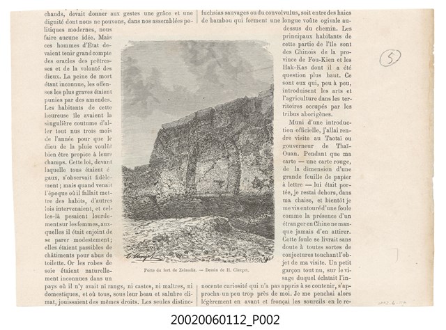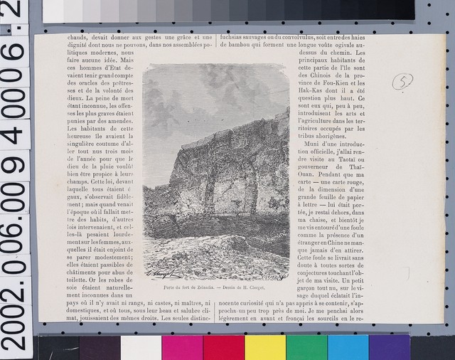 2. 本物件“Porte de fort de Zelandia“(熱蘭遮城城門),為葛雷傑特(H. Glerget)所繪。此圖收錄在《周遊世界之新航海日誌》(Le Tour du Monde Nouveau Journal des Voyages, Paris: Boulevad Sanit-Germain, 1875, 第30期,215頁)。本書為畫報性質,為西方各旅行者遊記之集合。書中209-240頁收有英國攝影家John Thomson 1871年來臺灣南部遊歷之作。文中的版畫為依Thomson所攝相片所重新繪製。Thomson 1871年所見的城堡已幾為斷垣殘壁。1867年時,英軍因樟腦糾紛曾攻佔城堡,炸燬清軍之軍火庫,城堡經此浩劫幾乎化為烏有。