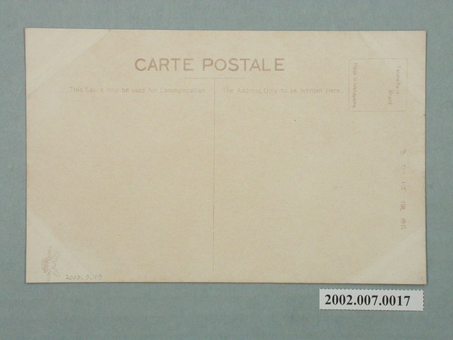 1.本物件為以臺灣總督府為主題之明信片,其正面為臺灣總督府黑白照片,畫面可見由側面角度呈現總督府,其建築風格呈現後期文藝復興式,樓高五層,中央塔樓更添建築權威意象,正門前方突出為車廳,側有車道,明信片左上方有「BUILDING OF GOVERNMENT, TAIHOKU, FORMOSA (臺灣.臺北)臺灣總督府」;背面為明信片橫式書寫面,以褐色單色印刷,右上角為郵票黏貼處,內有「Taisho Hato Brand Made in Wakayama」,右側為「郵便はがき」,正上方有「CARTE POSTALE」以及兩行字樣,由左至右為「This Space may be used for Communication.」、「The Address Only to be Written Here.」。2.臺灣總督府為日治時期臺灣最高的統治機構,該廳舍於西元1919年3月完工,其建築風格屬於後期文藝復興式,平面為日字形,臺灣總督府於二戰末期遭美軍轟炸,車廳部份損毀嚴重,其於戰後修復,西元1950年成為中華民國總統府,時至今日仍為國家行政中心。