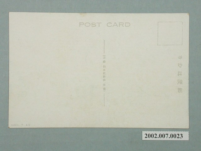 日本時代彩色印刷明信片,為「文化的臺北」明信片組系列之一,臺北生蕃屋本店發行。正面圖為臺灣總督府側面照。左上角說明文字:「26 The Taiwan Governers’ Office.(臺北)臺灣總督府:壯麗周圍を壓して立っ,巍巍として聳ゆる高塔は皇威を表徵する如く,遠く數里の外より望むとさ唯皇恩の洽さに感激する。」(譯:臺灣總督府,周圍壯麗的裝飾,巍巍高聳的高塔有如皇威的象徵,從數里之外遠看,唯有感激皇恩浩蕩)。背面印刷有「POST CARD,郵便はかき,臺北生蕃屋本店發行」等字。