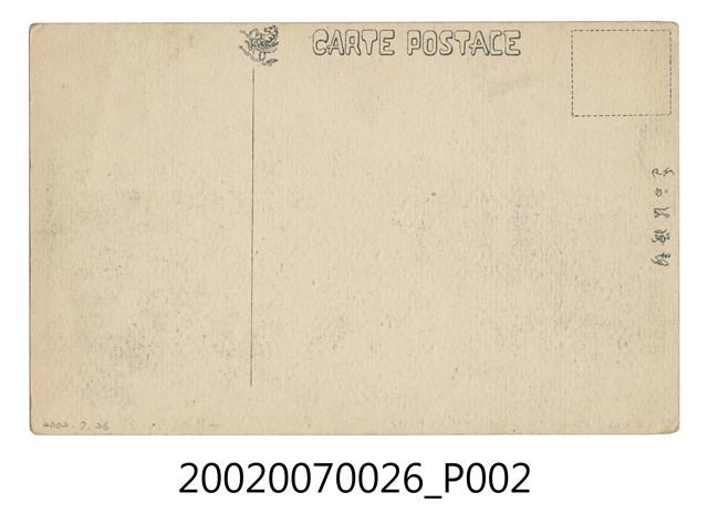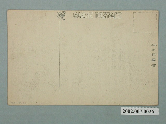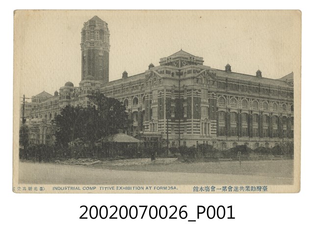 1.本物件為以臺灣總督府為景之明信片。正面為臺灣總督府之黑白照片。明信片中可見臺灣總督府高塔與立面,最左方有電線桿,其右方有樹遮住部分建築物。正面下方載有「臺灣勸業共進會第一會場本館」、「INDUSTRIAL COMP TITIVE EXHIBITION AT FORMOSA」、「臺北新高堂」字樣,為今臺北市博愛特區之中華民國總統府。背面為明信片書寫面,右上方有郵票黏貼處,右側有以漢字、平假名書寫之「郵便はがき」,正上方印有「CARTE POSTALE」字樣。2臺灣總督府設立於西元1895年,為日本殖民政府在臺灣的最高統治機關,圖中所見的臺灣總督府廳舍啟用於西元1919年,目前為中華民國總督府並為文化部所指定的國定古蹟。臺灣總督府由長野宇平治、森山松之助設計,於大正8年(1919)落成,主體平面呈「日」字形,為五層樓建築物,立面充滿文藝復興時期特色。3.臺灣勸業共進會為1916年起臺灣總督府舉辦的大型展覽活動,以慶祝始政二十週年為名,展示大日本帝國的豐富物產,鞏固殖民政策。