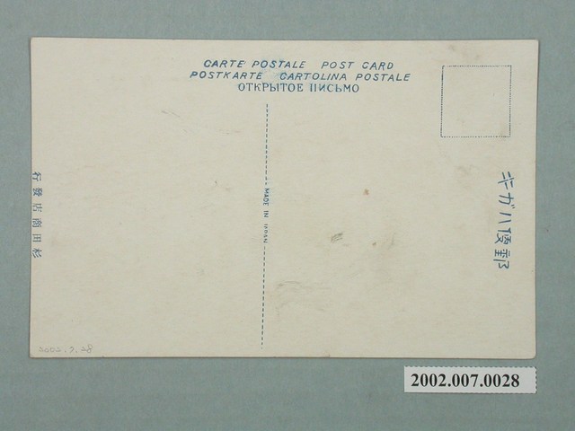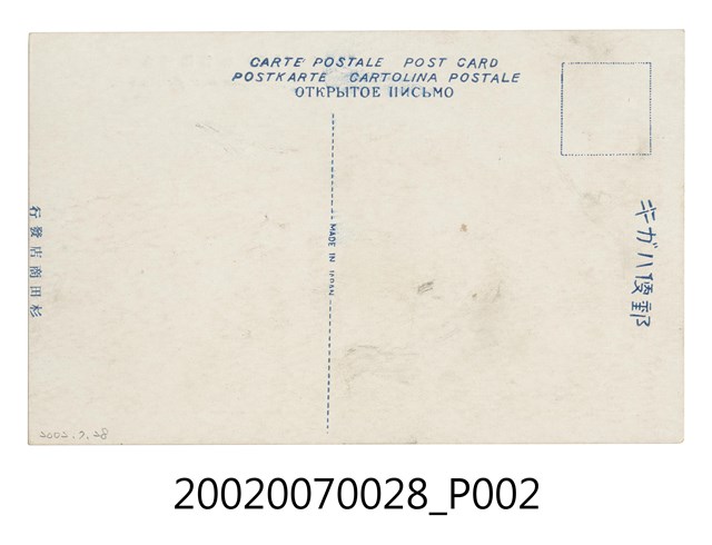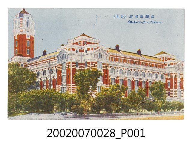1.本物件為以臺灣總督府為景之明信片。正面為臺灣總督府之彩色照片。明信片中可見臺灣總督府高塔與立面,下方有大量樹木,部分建築物因此被遮住。正面右上方載有「臺灣總督府(臺北)」、「Sotokufu office, Taiwan.」字樣,為今臺北市博愛特區之中華民國總統府。背面為明信片書寫面,右上方有郵票黏貼處,右側有以漢字、平假名書寫之「郵便はがき」,正上方印有「CARTE POSTALE POST CARD POSTKARTE CARTOLINA POSTALE OTKPbITOE IIИCbMO」,中央印有「MADE IN JAPAN」,左方印有「杉田商店發行」字樣。2.臺灣總督府設立於西元1895年,為日本殖民政府在臺灣的最高統治機關,圖中所見的臺灣總督府廳舍啟用於西元1919年,目前為中華民國總督府並為文化部所指定的國定古蹟。臺灣總督府由長野宇平治、森山松之助設計,於大正8年(1919)落成,主體平面呈「日」字形,為五層樓建築物,立面充滿文藝復興時期特色。