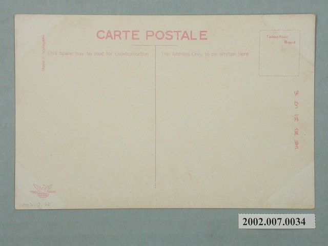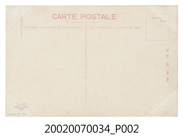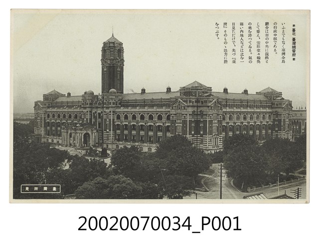 1.本物件為以臺灣總督府為景之明信片。正面為臺灣總督府之黑白照片,大致可見總督府高塔及右側立面。明信片右上方載有「臺北 臺灣總督府」、「いふまでもなく臺灣全島の行政中樞であゐ。廳舍は市の中央に巍然として聳え、宏壯堂々輪奐の美を誇つていゐ。氣の弱い內地人などは之を一目見ただけで、先づ『臺灣』そのもの、迫力に膽をつぶす。」(大意:臺灣總督府是臺灣的行政中樞,廳舍聳立於市中央,宏偉壯觀、美輪美奐,日本內地人一見都為它的魄力所震懾。)左下方有「臺灣所見」之字樣。背面為明信片書寫面,右上方有郵票黏貼處,印有「Taisho Hato Brand」字樣,右側有以漢字、平假名書寫之「郵便はがき」,正上方印有「CARTE POSTALE」、中間有一條分隔線,線左邊標有「This space may be used for Communication」、「Made in Wakayama」,線的右邊標有「The Address Only to be Written Here」字樣。左下方有老鷹註冊商標。2.臺灣總督府設立於西元1895年,為日本殖民政府在臺灣的最高統治機關,圖中所見的臺灣總督府廳舍啟用於西元1919年,目前為中華民國總督府並為文化部所指定的國定古蹟。臺灣總督府由長野宇平治、森山松之助設計,於大正8年(1919)落成,主體平面呈「日」字形,為五層樓建築物,立面充滿文藝復興時期特色。