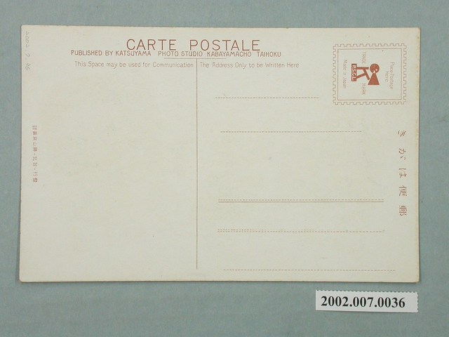2.正面影像黑白印刷,各幅影像下方印有橘色字「臺灣神社明治橋、臺灣總督府、商品陳列館」。背面則印有紅色字「郵便はがき,CARTE POSTALE、PUBLISHED BY KATSUYAMA PHOTO STUDIO KABAYAMACHO TAIHOKU、This Space may be used for Communication、The Address Only to be Written Here、發行・台北・勝山寫真館」,以及郵票張貼方框內印有「Place Postage Here、Made in Japan」與「TRADE MARK P.S.C.L.」商標圖案。