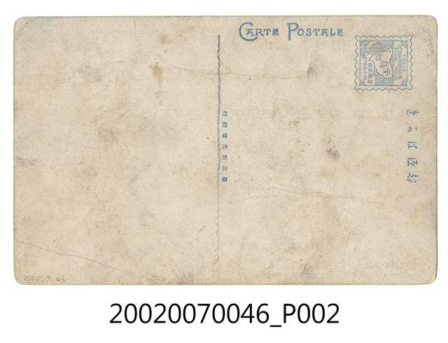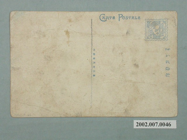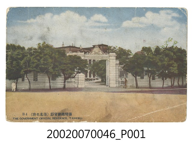 1.本物件為以臺北總督官邸為景之明信片。正面為臺北總督官邸大門外之彩色圖畫。明信片左側有一位身穿白色的男子,白色圍牆內外皆被樹包圍,白色大門敞開,門旁的兩個柱子上各有一盞燈,門口前站著一名士兵,右手拿著長槍。明信片下方載有「臺灣總督官邸(臺北名勝)」、「B4」、「THE GOVERNMENT, OFFICIAL RESIDENCE, TAIHOKU.」之字樣。該照片地點為今臺北市博愛特區之臺北賓館。背面為明信片書寫面,右上方有郵票黏貼處,黏貼處載有千鳥印、「TOKYO DESIGN PRINTING@KANDA TOKYO登錄商標TRADE MARK」,右側有以漢字、平假名書寫之「郵便はがき」,正上方印有「CARTE POSTALE」、中間印有「臺北新高堂發行」之字樣。2.臺灣總督府官邸現為臺北賓館為中華民國國定古蹟,該建築落成於西元1901年,主要作為歷任總督的住所,在此前曾以清代留下之基隆海關、前清福建臺灣承宣布政使司衙門、前清西學堂作為臨時的官邸,後來在兒玉源太郎總督任內下令興建,並曾於西元1912年改建,除總督住所外亦為接待重要賓客的場所。