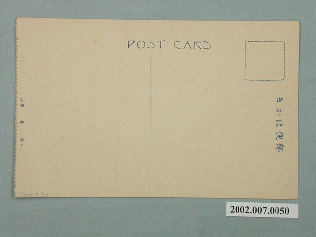 2.正面黑白影像滿版印刷,四周白邊,下方印有說明文字「臺北州廳」。背面印有藍色文字「郵便はかき、POST CARD、臺北州」,一側有撕痕,應為明信片整本裝訂邊。