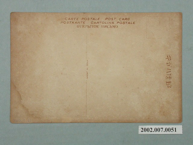 1.本物件為以臺北州廳為景之明信片。正面為臺北州廳之黑白照片。明信片可見臺北州廳及前面的廣場,明信片右側有位穿著和服的女的的背影,左側則有大島久滿次銅像。正面最下方載有「台灣台北廳」、「Taihokucho office Formosa.」、「(杉田商店發行)65」。該照片地點為今臺北市中正區之監察院廳舍。背面為明信片書寫面,右上方有郵票黏貼處,右側有以漢字、片假名書寫之「郵便ハガキ」,正上方印有「CARTE POSTALE POST CARD POSTKARTE CARTOLINA POSTALE OTKPbITOE IIИCbMO」,中央印有「MADE IN JAPAN」之字樣。2.臺北州廳係由臺灣總督府營繕課森山松之助設計,西元1912年開始興建歷時三年完工,日人領臺之初暫以清代之臺北府署為辦公場所,因此新建後的臺北州廳又稱為臺北廳新廳舍,目前為中華民國監察院之所在地亦為我國之國定古蹟。設計本廳舍之森山松之助技師畢業於東京帝國大學,西元1907年來臺,在臺灣參與多項重要的公共工程,如臺灣總督府、臺灣總督官邸、臺南州廳、臺中州廳等建築,為當時著名的建築師。
