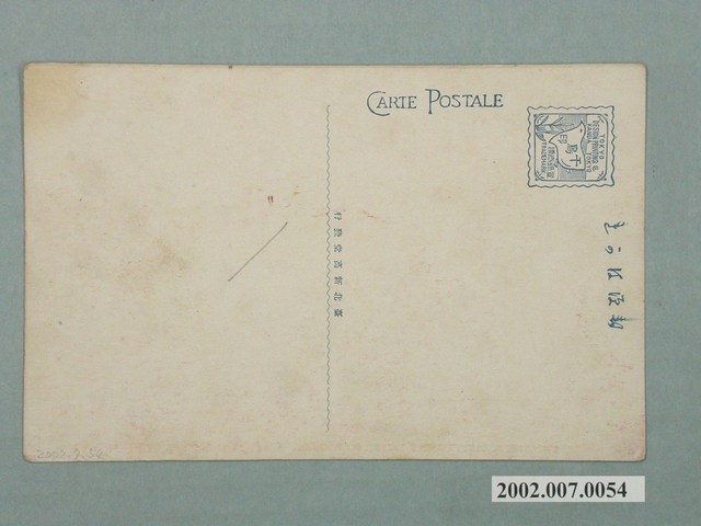 1.本物件為以台灣總督府中央研究所為景之明信片。正面為台灣總督府中央研究所之彩色圖畫。明信片可看見主建築兩層樓高,門口邊有個路燈,兩旁為矮籬笆,明信片最左邊則是高一點的圍牆。籬笆的內外兩側接種有大樹。該建築的屋頂及窗戶皆為藍色。正面最下方載有「臺灣總督府中央研究所(臺北名勝)」、「NVESTIGATION INSTITUTE OF THE TAIWAN GOVERNMENT.」「A6」之字樣。該照片原址現為臺北市中正區之教育部。背面為明信片書寫面,右上方有郵票黏貼處,黏貼處載有千鳥印、「TOKYO DESIGN PRINTING@KANDA TOKYO登錄商標TRADE MARK」,明信片右側有以漢字、片假名書寫之「郵便はがき」,正上方印有「CARTE POSTALE」,中央印有「臺北新高堂發行」之字樣。2.臺灣總督府中央研究所位於日治時期的幸町,原址為現今的中華民國教育部,主要業務為臺灣相關的產業、衛生等基本調查研究之綜合研究單位,其設立法源係根據西元1909年之臺灣總督府研究所官制,同年4月成立臺灣總督府研究所並分化學及衛生兩部。西元1921年依據勅令台灣總督府中央研究所官制,因此臺灣總督府研究所改制為臺灣總督府中央研究所,改制後中央研究所共分四部分別為農業、林業、工業及衛生部,另設有庶務課。