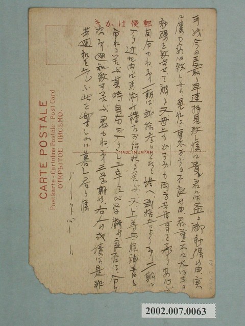 1.本物件為以臺灣第二守備隊司令部為景之明信片。正面為臺灣第二守備隊司令部之黑白照片。明信片右上角有破損痕跡,左右兩旁皆有樹木,後方為台灣第二守備隊司令部之建築,中央為圓拱門,拱門上有圓形小窗戶,拱門旁皆有圓拱形狀之窗臺。正面下方載有「臺灣第二守備隊司令部」、「(不許復製)」之字樣。該照片地點為臺南。背面為明信片書寫面,左上方有郵票黏貼處,正上方有以漢字、平假名書寫之「郵便はがき」,左方印有「CARTE POSTALE」、「Postkarte - Cartolina Postale - Post Card OTKPbITOE IIИCbMO.」中間有一條分隔線,線上印有「MADE IN JAPAN」之字樣。該書寫面有滿滿的黑色字跡,大致內容為交代自己學校近況。臺灣第二守備隊前身為臺灣守備混成旅團,創設於西元1896年,當時全軍隸屬於臺灣總督,主要是為了乙未戰役後的臺灣守備工作並掃除當時臺灣各地的匪徒。2.西元1907年重新編製為臺灣守備隊,分為臺灣第一守備隊與臺灣第二守備隊分別駐守於臺北與臺南,編制較臺灣守備混成旅團精簡,西元1919年臺灣守備隊擴充升格為臺灣軍。