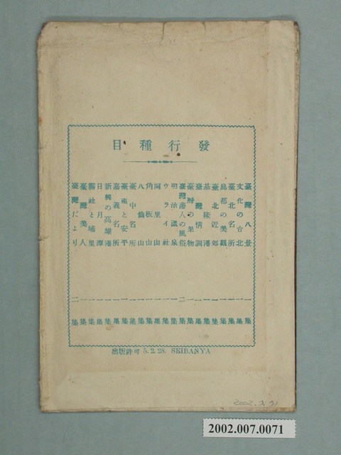 此物件為臺北名所繪はがき集之封面。為直式印刷,以黑色為底色,右邊有一塊圓拱形形狀的部份有插畫。插畫可看見淺藍色的香蕉葉,右邊則為建築物。封面最右方載有「臺北名所繪はがき集」,左上角載有「高級天然色版」之字樣。背面寫有臺灣八景、文化臺北、臺北名所、島都美觀、臺北近郊等發行種目。