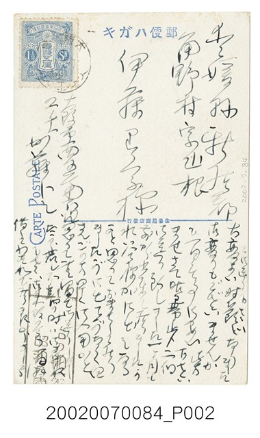 1.本物件為以臺北榮町通り為景之明信片。正面為臺北榮町街街景之彩色照片。明信片左右兩側皆為建築,建築前皆有一排電線桿、行人、汽車、人力車及騎腳踏車的人。左側第一棟建築為以紅磚白飾帶的辰野式建築。右側可看見有一個淡紫色招牌,以白色寫著「風月堂菓子舖」。明信片右下角可看見一名穿著和服、手打洋傘的女性,其右後方有個小朋友。明信片正面上方載有「台北榮町通り」、「118. SAKAIMACHI STREET, TAIPEH FORMOSA.」之字樣。該明信片地點為現今臺北市中正區衡陽路及重慶南路一帶,「風月堂菓子舖」旁的轉角商店為今星巴克重慶門市。背面為明信片書寫面,左上方有郵票黏貼處,黏了一張價值「壹錢五厘(1又1/2)」的藍色郵票,上面蓋有寫著「大阪」的郵戳。明信片上方有以漢字、片假名書寫之「郵便ハガキ」,左方印有「CARTE POSTALE」,正中央印有「生蕃屋商店發行」之字樣。該明信片為寄至愛媛縣角野村的伊藤,明信片下方寫滿了文字。背面為明信片書寫面,右上方有郵票黏貼處,明信片右側有以漢字、平假名書寫之「郵便はがき」,正上方印有「POST CARD」,正中央印有「(臺北 生蕃屋本店 印行)」之字樣。2.該明信片地點為現今臺北市中正區衡陽路及重慶南路一帶,其中辻利茶舖為今星巴克重慶門市。