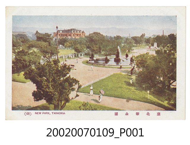 1.本物件為以臺北新公園為景之明信片。正面為臺北新公園之彩色照片。照片可見中央有一個水池,四周為道路及綠地,園內有許多行人。明信片正面下方載有「臺北新公園」、「(48)NEW PARK, TAIHOKU.」之字樣。該照片地點為今臺北市中正區之二二八和平紀念公園。背面為明信片書寫面,右上方有郵票黏貼處,黏貼處載有千鳥印、「TOKYO DESIGN PRINTING@KANDA TOKYO登錄商標TRADE MARK」,右側有以漢字、平假名書寫之「郵便はがき」,正上方載有「CARTE POSTALE」,中央則有「臺北新高堂發行」之字樣。2.臺北新公園起建於西元1899年約9年後才初步落成,為一大眾公共設施的近代公園,之所以稱為臺北新公園是因為相對於圓山公園,臺北新公園的興建及落成時間都晚於圓山公園之故。