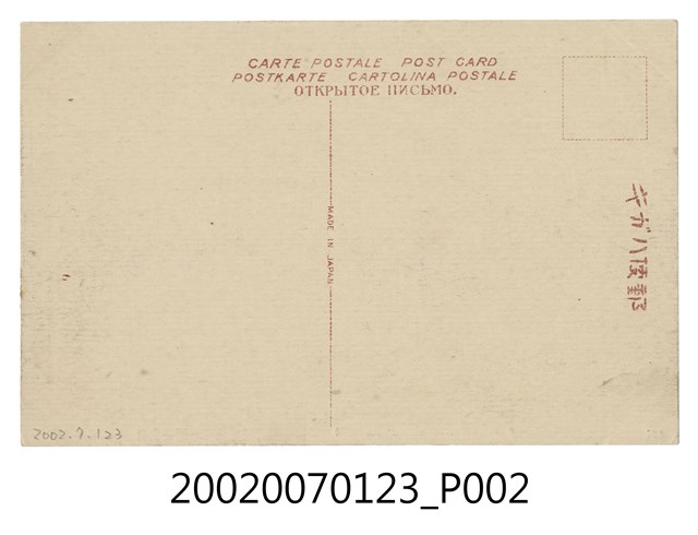 1.本物件為以臺北公園為景之明信片。正面為臺北公園之黑白照片。照片可見一個廣場上中間立有涼亭,四周長椅以同心圓方式排列成四排環繞著涼亭。該廣場四周皆為樹林。明信片後方遠處為臺北病院,後方右側為臺灣總督府。明信片正面下方載有「台北公園ト台北病院全景」、「Taihoku Byoen and Taihoku Park」、「(生蕃屋發行)」、「441」之字樣。其照片地點為今臺北市中正區二二八紀念公園,該廣場現在改為半圓頂型舞臺,臺北病院為今臺大醫院,臺灣總督府博物館為今臺灣博物館。背面為明信片書寫面,右上方有郵票黏貼處,右側有以漢字、片假名書寫之「郵便ハガキ」,正上方印有「CARTE POSTALE POST CARD POSTKARTH CARTOLINA POSTALE OTKPbITOE IIИCbMO」,中央印有「MADE IN JAPAN」之字樣。