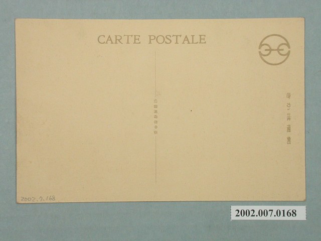 1.本物件為以臺中公園為景之明信片。正面為臺中公園內的池子與亭子之黑白照片。明信片可見中央處有湖心亭,其餘地方皆為水池,四周皆被群樹環繞。左側湖面可看見一群人乘著一艘獨木舟。右側湖面則有噴水器在噴水。明信片正面下方載有「(臺中)臺中公園」之字樣。背面為明信片書寫面,右上方有個圓形的圖形,為臺中市役所之記號。右側有以漢字、平假名書寫之「郵便はがき」,正上方印有「CARTE POSTALE」,中央處印有「臺中市役所發行」之字樣。2.臺中公園位於臺中市的東北端,西元1903年始建,面積約28,883坪,園內有四千餘坪的水池,以及各種林泉花木,日治時期建有物產陳列館、臺中神社、後藤新平像、池亭等建築;其中池亭為1908年慶祝縱貫鐵路全線通車所建,來臺主持通車式的日本閑院宮載仁親王曾於此亭休憩。戰後曾更名為中山公園,日治時期建築除池亭及北門城樓外都已拆除。池亭改稱為「湖心亭」,北門城樓改稱為觀月樓。