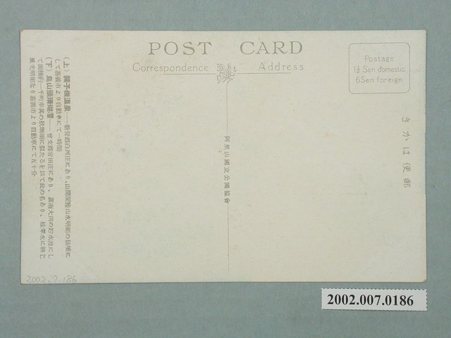 1.阿里山國立公園協會發行之多色印刷明信片,影像內容包括2張圖,左上為臺南州關子嶺溫泉街景,右下為俯視形狀如珊瑚的烏山頭水庫的湖光山色。2.正面影像為左上右下2張圖,無文字,背面印有灰色文字「郵便はかき、POST CARD、Correspondence、Address、阿里山國立公園協會」,以及說明文字:「(上)關子嶺溫泉……新營郡白河庄にあり、山間閑雅山水明媚の仙境にして嘉義市より自動車にて一時間。(下)烏山頭珊瑚潭……曾文郡官田庄にあり、嘉南大圳の貯水池にして面積約一千町步其の狀珊瑚に似たるを以て此の名あり、綠翠水に映じ風光明媚なり嘉義市より自動車にて五十分。」(譯:上圖為關子嶺溫泉,位於新營郡白河庄,山間閑雅、風光明媚的仙境,從嘉義市搭汽車1小時車程。下圖為烏山頭珊瑚潭,位於曾文郡官田庄,是嘉南大圳的蓄水池,面積約1千町步,因其形狀與珊瑚相似而得名,綠色湖水映照出美麗的風景,從嘉義市搭汽車50分車程。)通信欄與地址欄分隔線上有飛馬商標圖案,郵票方框印有面額文字「Postage 1 1/2 Sen domestic、6 Sen foreign」。 本件與館藏號2001.008.1416相同。3.阿里山國立公園協會是為推動新高阿里山國立公園之成立,於1931(昭和6)年4月由嘉義市官方與民間共同設立,置於嘉義市役所庶務課之下。預算一部分來自嘉義市及臺南州補助,大部分由地方人士捐獻。(曾祥宇、曾明德撰寫)