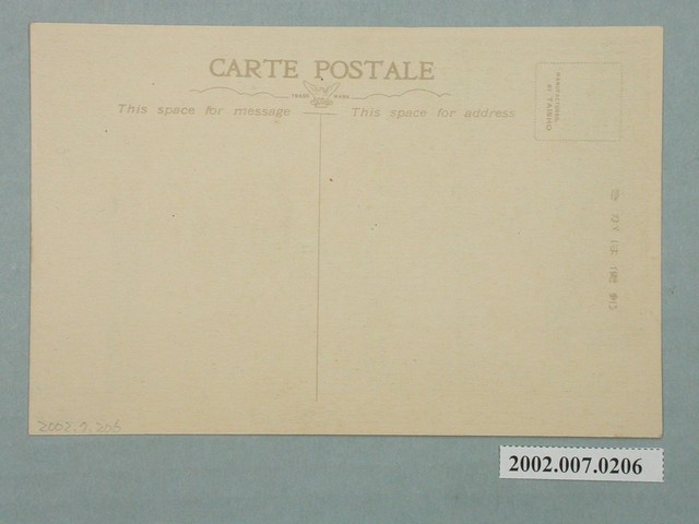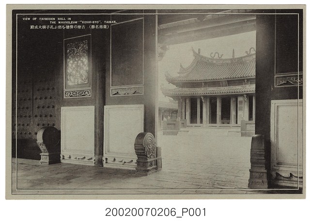 1.本物件為以臺南孔子廟為景之明信片。正面為臺南孔子廟之黑白照片。照片可從大門向內看到臺南孔子廟,門前有道,孔子廟樓前有階梯、矮牆。明信片左上方印有「VIEW OF TAISEIDEN HALL IN THE MAUSOLEUM "KOSHI-BYO", TAINAN (臺南名勝)古聖の偉德を偲ぶ孔子廟大成殿」之字樣,意為感念古人的偉德孔廟大成殿。背面為明信片書寫面,右上方有郵票黏貼處,黏貼處內有「MANUFACTURED BY TAISHO」之字樣,右側有以漢字、平假名書寫之「郵便はがき」,上方印有「CARTE POSTALE」、「 This space for message」、「This space for address」之字樣,中間有一個老鷹的註冊商標,商標內有「TRADE MARK」之字樣,中央有一條分隔線。2.孔廟的建置一般為左學右廟,左學即為學校、學堂的空間。臺南孔廟之明倫堂即為左學,右廟則以大成殿為主的建築群,現今位於臺南中心區的臺南孔廟大成殿之樣貌約為西元1977年整建後的結果,大成殿內懸掛由清廷領臺以來歷任皇帝所頒賜的牌匾。