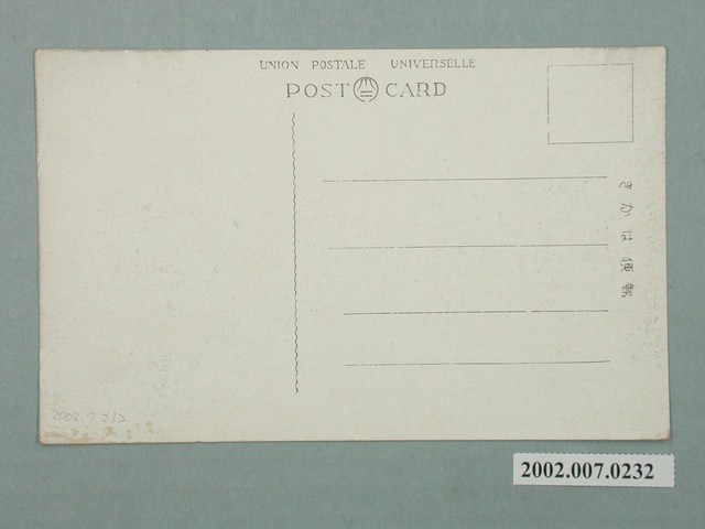 1.本物件為以臺南公園為景之明信片。正面臺南公園之黑白照片。明信片正面可見中央為湖,四周被綠地及樹木環繞,左側湖畔處有個涼亭。湖面上映著景色。正面左下方載有「台南公園中之島」、「Nakanosima in Tainan Park」之字樣,右下方則載有「上川商店發行」之字樣。背面為明信片書寫面,右上方有郵票黏貼處,右側有以漢字、平假名書寫之「郵便はがき」,正上方印有「UNION POSTALE UNIVERSELLE」、「POST CARD」之字樣。2.臺南公園位於日治時期的北門町,近臺南車站,西元1917年竣工,總面積4萬5000多坪。曾被作為熱帶實驗林,內更設有公園管理所,為全臺灣第一座現代化公園管理所,小型動物園、運動場、噴水池等亦包含於公園內。除了自然景觀外,園內尚有昭和年間移入的重道崇文坊以及埋於地下的大北門遺址、城牆遺址等人文遺跡。