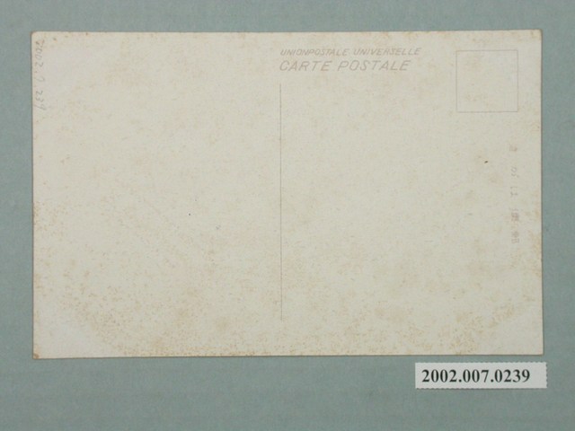 1.本物件為以臺南公園為景之明信片。正面為白底,下方貼有一張臺南公園之黑白照片,上方空白處蓋有紫色印章,有一個中式建築的圖案並載有「臺南駅」、「12.4.27」之字樣。明信片下半部則可見中間噴水池正在噴水,四周為空地及樹林。正面下方載有「臺南公園噴水池附近」、「NEAR FOUNTAIN IN TAINAN PARK, FORMOSA.」之字樣。背面為明信片書寫面,右上方有郵票黏貼處,右側有以漢字、平假名書寫之「郵便はがき」,正上方印有「UNION POSTALE UNIVERSELLE」、「CARTE POSTALE」之字樣。2.臺南公園位於日治時期的北門町,近臺南車站,西元1917年竣工,總面積4萬5000多坪。曾被作為熱帶實驗林,內更設有公園管理所,為全臺灣第一座現代化公園管理所,小型動物園、運動場、噴水池等亦包含於公園內。除了自然景觀外,園內尚有昭和年間移入的重道崇文坊以及埋於地下的大北門遺址、城牆遺址等人文遺跡。