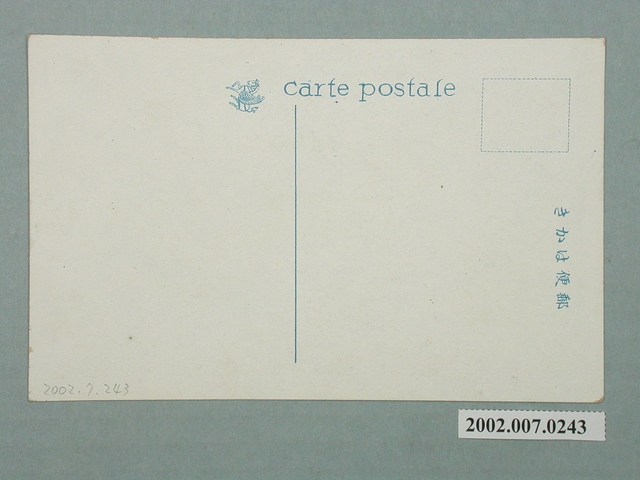 1.本物件為以臺南赤崁樓為景之明信片。正面為臺南赤崁樓之彩色圖畫。該照片是從約二層樓的高度所看過去的景色,中央可看見兩幢比較高的中式閣樓。其一旁種有大樹。明信片正面下方載有「赤崁樓(台南)」、「Sakkanro, Tainan.」之字樣。背面為明信片書寫面,右上方有郵票黏貼處,明信片右側有以漢字、平假名書寫之「郵便はがき」,正上方印有「carte postale」之字樣,其左方有一隻馬的圖案。2. 赤崁樓係西元1653年由荷蘭人所建,時稱普羅民遮城、プロビンシヤ城址、紅毛城;1661年鄭成功驅逐荷蘭人後將此樓稱為承天府以統治臺灣,1879年清廷在此基礎上建文昌閣、海神廟與蓬壺書院,1895年後曾作為陸軍衛戍醫院及臺南師範學校使用。現存建物為其殘跡,以及海神廟與文昌閣。