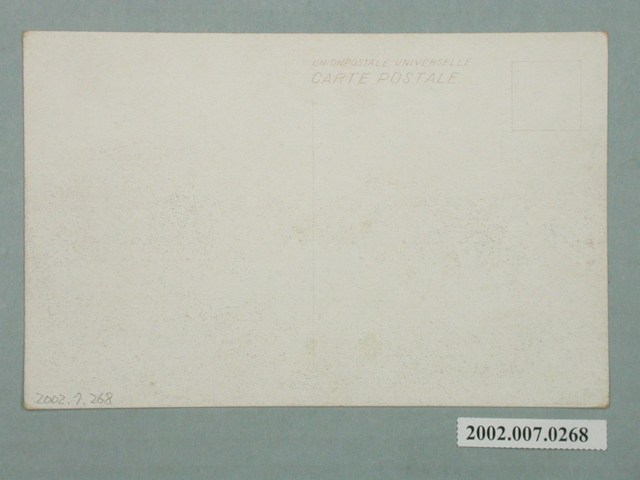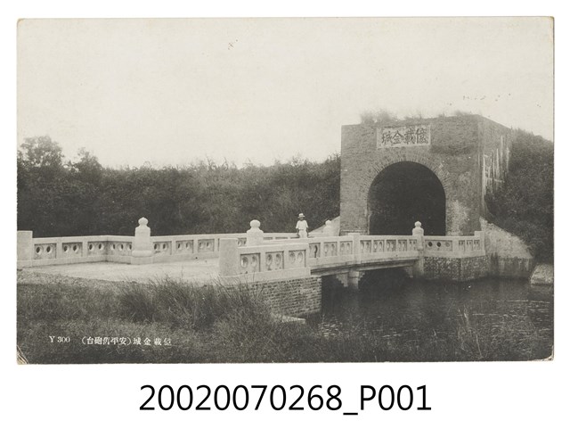 1.本物件為以億載金城為景之明信片。照片為億載金城之黑白照片。照片可見一座白色的平橋及億載金城城門。橋上靠近城門處有個男性頭戴帽子倚靠在圍欄上。橋下為河流。照片左下方載有「億載金城(安平舊砲臺)」、「Y300」之字樣。背面為明信片書寫面,右上方有郵票黏貼處。右側有以漢字、平假名書寫之「郵便はがき」,正上方印有「UNION POSTALE UNIVERSELLE」、「CARTE POSTALE」之字樣。2. 億載金城又稱二鯤鯓砲臺。西元1874年牡丹事件後清廷派沈葆楨任福建巡臺使節,沈葆楨為了防範日本因此拆除熱蘭遮城,再以這些建材建造億載金城,最後於光緒二年(1876年)完工,當時共有大砲5門、小砲4門並配置臺灣安平水師副將周振邦及300名兵士駐守,入口城門題字「億載金城」為沈葆楨落款。西元1895年日本領臺後在南部的劉永福軍也曾在此與日本軍接頭後向日軍投降。