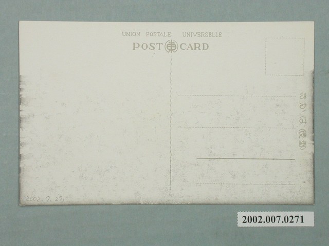 1.本物件為以高雄市街為景之明信片。該明信片為高雄市街全景之黑白照片。照片為由高處俯瞰高雄市街景的構圖,可看見左下方為馬路及電線桿,右側則是一大片房屋,馬路和房屋之間植有大量樹木。照片左上方載有「(臺灣高雄)高雄市街全景」、「The full view of Takao city」之字樣。背面為明信片書寫面,右上方有郵票黏貼處。右側有以漢字、平假名書寫之「郵便はがき」,正上方印有「UNION POSTALE UNIVERSELLE」、「POST CARD」之字樣。2.高雄市街主要指哨船頭、鹽埕埔一帶分別為今高雄市鼓山區及鹽埕區,自清代即有中國漁民移住於此,隨著人口漸增成為一個市街,然因沒有都市計畫之故,當時的街路較為狹小,而隨著日本時代高雄港的新築與修築市街的樣貌漸漸改變。