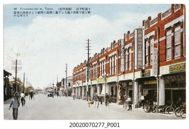 1.本物件為以高雄的山下町街為景之明信片。該明信片為填色照片,雖然有些部分有顏色,但其他部分仍是黑白的。照片可見右側為一整排的建築,騎樓處停放著腳踏車或是擺置貨物。建築前為馬路,兩側都設有電線桿,馬路上有許多行人、汽車、腳踏車、人力車。照片左上方載有「66」、「Yamashita-cho st., Takao.」、「(臺灣高雄)山下町通り」、「山下町通り從來の高雄市より新開の高雄に通ずる大通り高雄で最も賑かな所です」之字樣。(日文大意:山下町街是高雄最熱鬧的地方)背面為明信片書寫面,右上方有郵票黏貼處。右側有以漢字、平假名書寫之「郵便はがき」,正上方印有「POST CARD」,中央則有「(臺北 生蕃屋本店 發行)」之字樣。2.本物件之高雄指的是高雄市,為日治時期高雄州之州廳所在地,高雄市位居縱貫鐵道終點,又是南迴鐵路的起點,同時也是南臺灣最大港口的所在地,亦是當時臺灣的第二大港口,因此當時許多通往中國及南洋地區皆由此出口,出口的貨物主要有米、砂糖、肥料、水泥等。