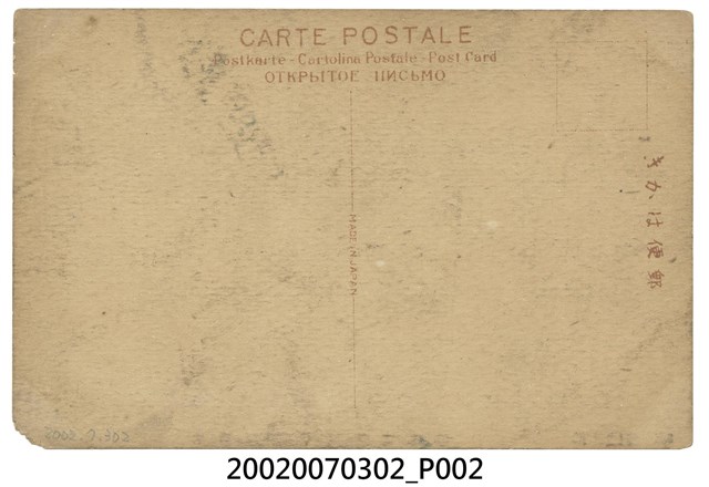 1.本物件以臺南安平海水浴場為主題,黑白樣式。正面為臺南州安平海水浴場之圖像。下方以漢字書寫「台南州安平港外海水浴」、「〈不許復製 〉311」。背面右上角為郵票黏貼處,右側有以漢字、平假名書寫之「郵便はがき」,上方以英文字母書寫「CATRE POSTALE」、「Postkarte-Cartolina Postale Post Card」、「OTKPBITOE IINCBMO」。2.全臺灣最早的海水浴場於西元1902年設立,位於基隆。此後臺灣各地陸續設立海水浴場。安平海水浴場設於1909年,而海水浴場多採期票制,以8到10月為一個期間,為當時民眾休閒、消暑的好去處。