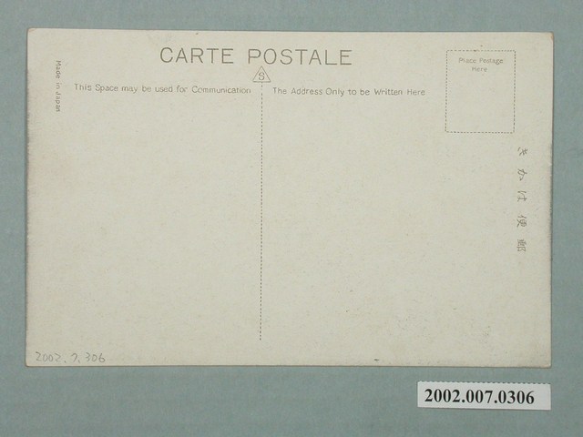1.本物件以彰化公園為主題,黑白樣式。正面為彰化公園植物林之圖像。左下角以漢字書寫「【彰化名勝】彰化公園 椰子並木」、「及八卦山項(臺灣十二勝)北白川宮御遺跡碑」。背面右上角為郵票黏貼處,右側有以漢字、平假名書寫之「郵便はがき」,上方以英文字母書寫「CARTE POSTALE」、「This Space may be used for Communication」、「The Address Only to be Written Here」。2.對於風景名勝的認定,於清領時期《重修臺灣府志》中紀錄了「臺灣八景」一詞。至日治時期總督府大力推廣觀光事業,臺灣日日新報社於西元1927年推出「臺灣八景票選活動」,故產生「二別格、八景、十二勝」的用詞。