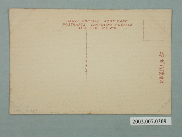 1.本物件以臺灣水果為主題,黑白樣式。正面為香蕉、鳳梨、龍眼等水果之圖像。下方有「臺灣果物(龍眼肉)(パナ)(パイナツプル)(ジャポン)」,以英文書寫「Formosan」。左下方以漢字書寫「生蕃屋發行」。背面右上角為郵票黏貼處,右側有「郵便はがき」,上方以英文字母印刷「CARTE POSTALE」、「Postkarte-Cartolina Postale-PostCard」、「OTEPLITOE IINCBMO」,中間以英文字母印刷「MADE IN JAPAN」。