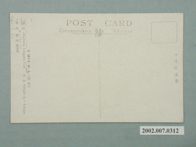 1.本物件以臺灣水果為主題,彩色樣式。正面為龍眼之圖像。背面右上角為郵票黏貼處,右側有「郵便はがき」,上方以英文字母書寫「POST CARD」、「Correspondence」、「Address」。左側有「學名:Euphoria Longana Lam 英名:Lungam 科名:無患樹科」。上方有一飛馬形商標。