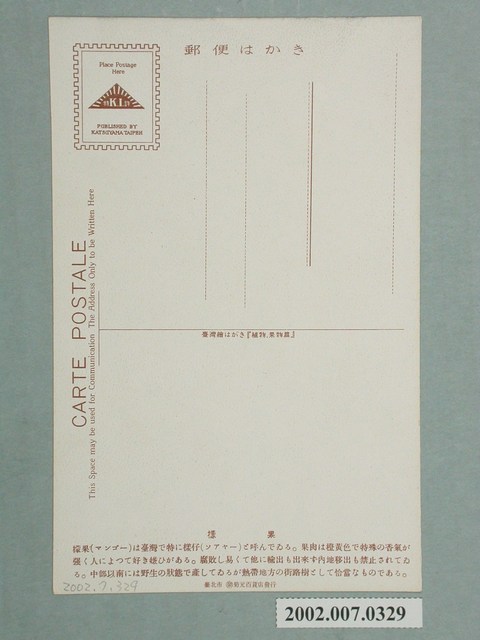 1.本物件以臺灣水果為主題,彩色樣式。正面為芒果之圖像。背面右上角為郵票黏貼處,有1印著「特許 K.I.」字樣的三角形商標,右側有「郵便はがき」,上方以英文字母書寫「CARTE POSTALE」、「This Space may be used for Communication」、「The Address Only to be Written Here」。下方有「檬果(マンゴー)は臺灣で特に様仔(ソアヤー)と呼んでゐる。果肉は橙黃色で特殊の香氣が強く人によって好き嫌ひがある。腐敗し易くて他に輸出も出來ず內地移出も禁止されてゐる。中部以南には野生の狀態で產してゐるが熱帶地方の街路樹として恰當なものである」大意為:臺灣人所稱的芒果,果肉為橙黃色具有特別的濃郁香氣。因容易腐敗,故禁止向內地輸出,生長於中部以南的野外地區,在熱帶地區很適合做為街道樹。底部中間以漢字書寫「臺北市 菊元百貨店發行」。